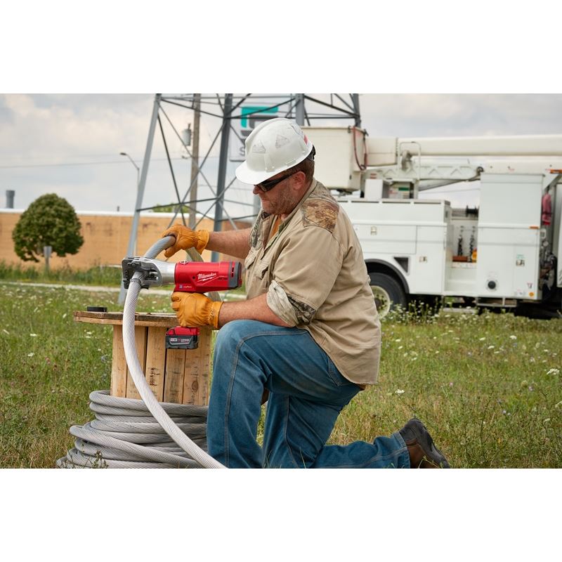 The M18 Force Logic 1590 ACSR cutter is the simplest way to cut transmission lines. A patent pending jaw design enables opening with just two fingers, enhancing alignment while delivering easiest operation with class 3 gloves. The wire automatically closes the jaw, providing hands-free jaw closure and the easiest mid-span cuts. Fully balanced, only 11.75 lbs, and the fastest transmission cutter, the M18 Force Logic 1590 ACSR cutter delivers the best control while enhancing lineman's productivity and reducing fatigue. The M18 Force Logic 1590 ACSR cutter features a fully enclosed high speed hydraulic pump, brushless motor, REDLINK electronics and REDLITHIUM battery delivering ultimate reliability in the toughest conditions. Featuring Milwaukee ONE-KEY Technology, view tool usage, receive notifications for recommended maintenance and sync information wirelessly to the cloud. The kit includes M18 REDLITHIUM XC 5.0 extended capacity battery, AC/DC wall and vehicle charger, utility bag and carabiner.