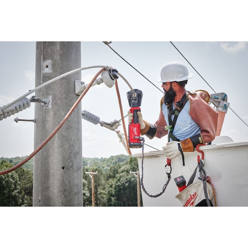 Our M18 FORCE LOGIC 12T Latched Linear Crimper is The Fastest Way To Crimp. Equipped with fully enclosed high speed hydraulics, a POWERSTATE Brushless Motor, REDLINK Electronics, and REDLITHIUM Batteries, the crimp tool provides the fastest crimp speed and unmatched reliability in the toughest conditions. The linear crimper is designed to allow one handed use in multiple orientations. An enlarged trigger and electronic release button enable both left and right handed users to easily activate the tool while wearing Class 3 gloves. The head of the crimper rotates 340 degrees and the quick release and push to close style latch pin can be easily opened or secured with just one touch. Predictive Force Monitoring (PFM) constantly measures output force to deliver the fastest crimp speeds across all connector types and sizes and ensures full pressure is reached every time. A pre crimp battery check confirms that the battery has enough charge to complete a full crimp. Full compatibility with all industry standard U dies allows you to use the dies already on your truck. Our crimper creates UL Classified crimps per UL 486A B on #8 750 MCM Copper and Dual Rated Anderson, Blackburn, Burndy, Ilsco, Panduit, Penn Union, and Thomas & Betts color coded lugs and splices when using our EXACT 12T U Dies. Our crimper is integrated with our ONE KEY Technology, giving the crimper the ability to store real time crimp data.INCLUDES: