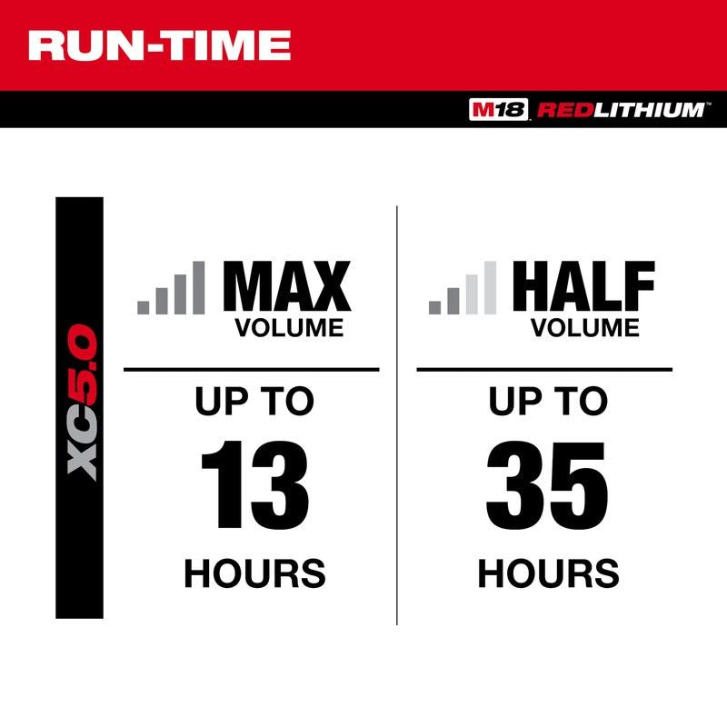 Up to 13 hours of runtime on an M18 XC5.0 battery at MAX volume