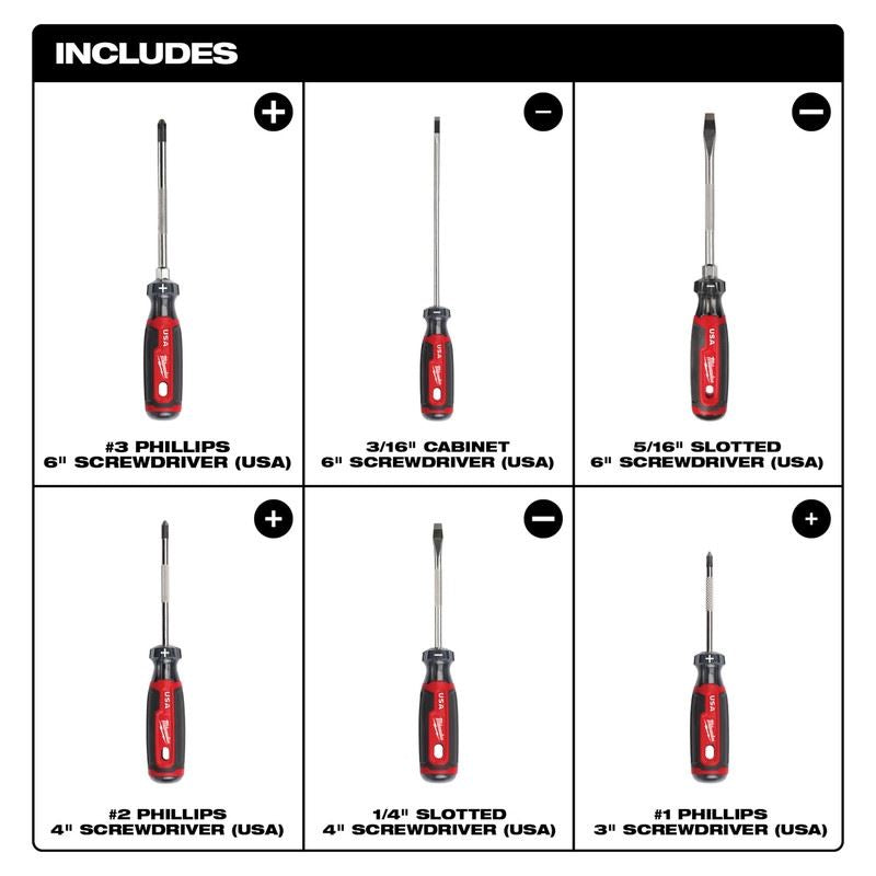 The Milwaukee 6-Piece Cushion Grip Screwdriver Set (USA) is manufactured to give the professional the best-fitting screwdriver with max grip. These screwdriver tips are custom machined to deliver a precise fit and reduce stripping during demanding fastening applications. For added confidence, the tips are laser etched to increase the gripping surface. Manufactured with high-strength, boron-infused steel for increased hardness, these screwdrivers stand up to the demands of the site with ultimate durability and life. Providing increased versatility, select screwdrivers include a wrench-ready bolster for added torque and a knurled shank for precision control. Quick identification markings on the handle make it easy to identify screwdriver tip size including Phillips, slotted, and cabinet tips. The 6-Piece Set includes screwdrivers offered in 3-inch to 6-inch shank lengths. The Milwaukee 6-Piece Cushion Grip Screwdriver Set is made in the USA with cutting-edge manufacturing technology and the highest quality USA-sourced materials all backed by a complete Lifetime Guarantee.INCLUDES: